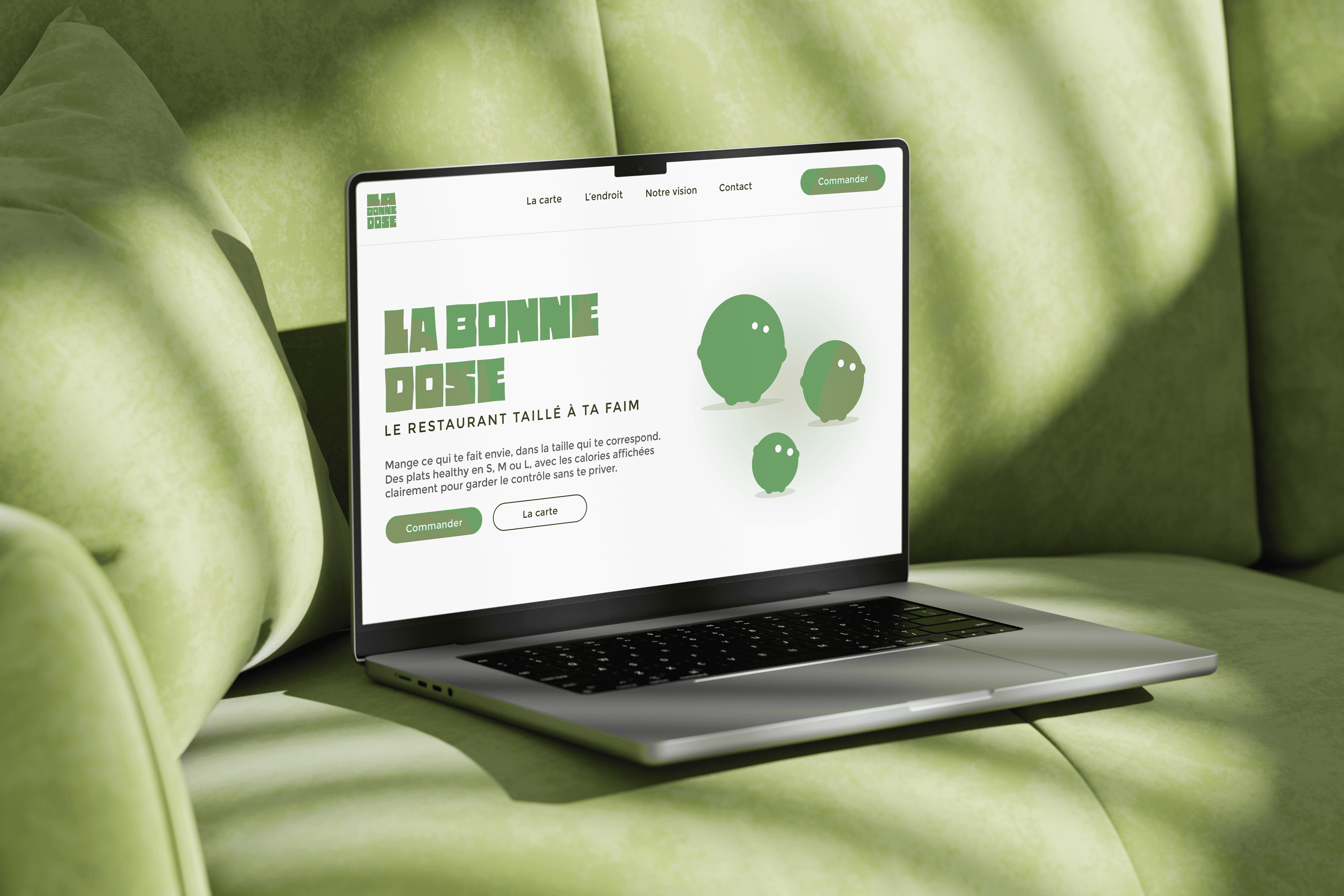 J’ai choisi de représenter la marque à travers trois mascottes, chacune associée à une taille de menu : S, M et L. Ce choix permet de donner au restaurant un élément visuel fort, à la fois reconnaissable et attachant. Je voulais également créer une ambiance chaleureuse, accueillante et professionnelle. J’ai donc opté pour une couleur principale verte, des visuels sobres, ainsi qu’un univers mêlant bois et verdure pour renforcer cette sensation de confort et de proximité.